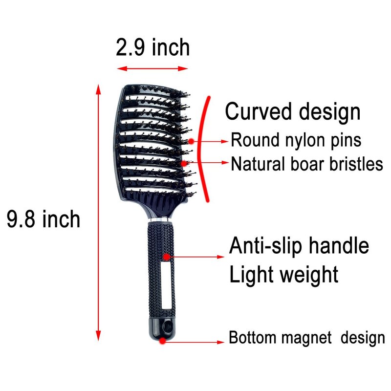 - Curved vented brush with a combination of Boar Bristles and Nylon Pins. Brush Size: 9.8 inch * 2.9 inch.