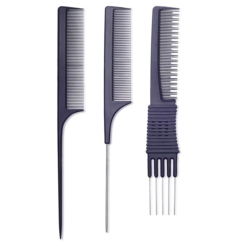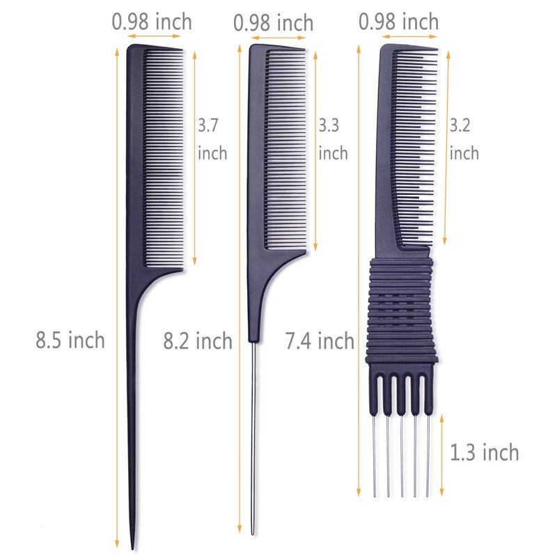 - 1 teasing comb with stainless steel lift, 2 rat tail carbon combs.