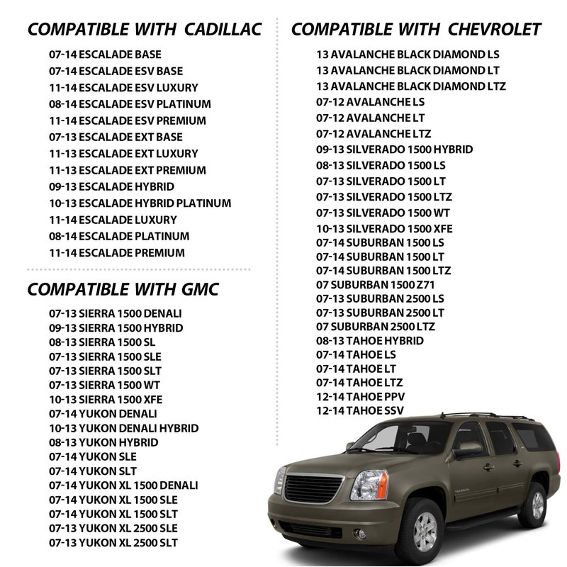- FITMENT - (1) 2007-2013 CHEVY Avalanche (2) 2007-2013 CHEVY Silverado 1500 (3) 2007-2014 CHEVY Suburban 1500 2500 (4) 2007-2014 CHEVY Tahoe (5) 2007-2013 GMC Sierra 1500 (6)2007-2014 GMC Yukon/Yukon XL (Detailed fitment below)