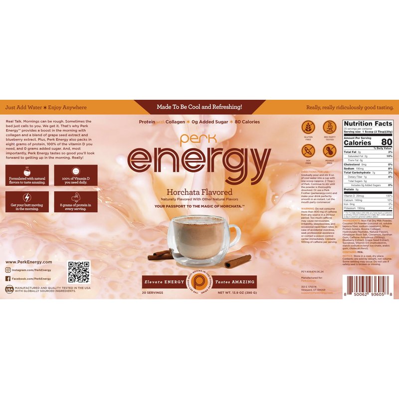 Perk Energy Original Horchata Energy Drink Powder (20 Servings) - Gluten-Free, Peanut-Free