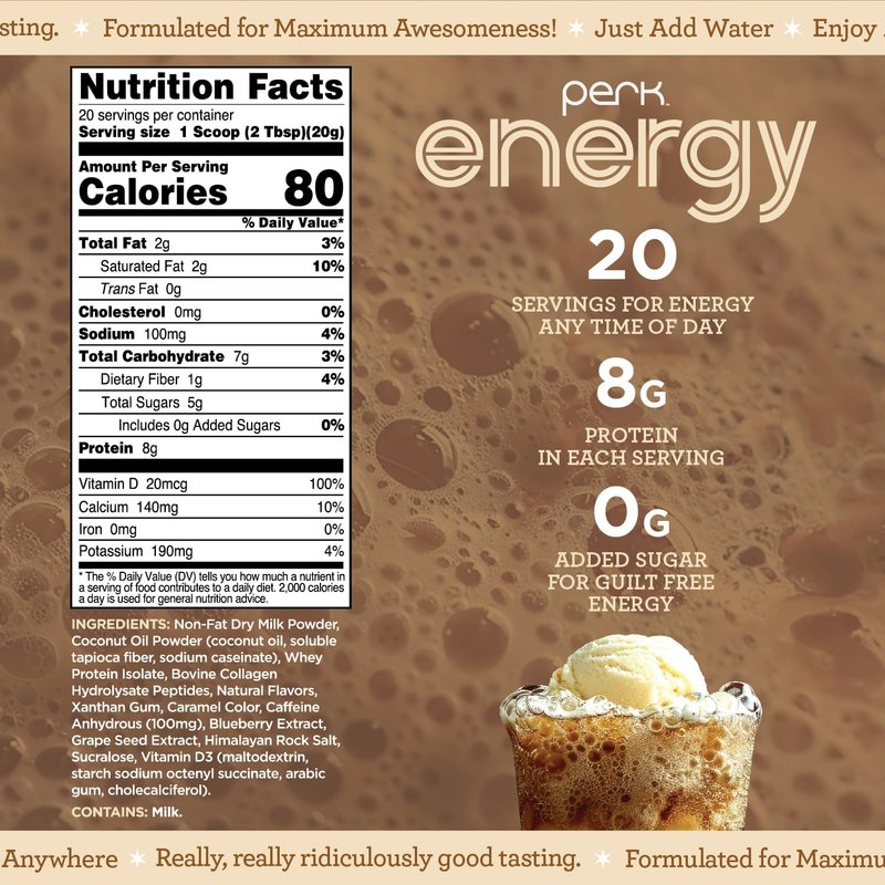Experience the nostalgic flavor of a root beer float in a revitalizing and energizing drink with Perk Energy Original. Each serving is a perfect blend of invigorating energy and delightful taste, designed to kickstart your day or give you that much-needed afternoon boost. Crafted with high-quality ingredients, this product is packaged in a GMP-compliant facility and undergoes rigorous third-party testing by independent laboratories to ensure safety and effectiveness.