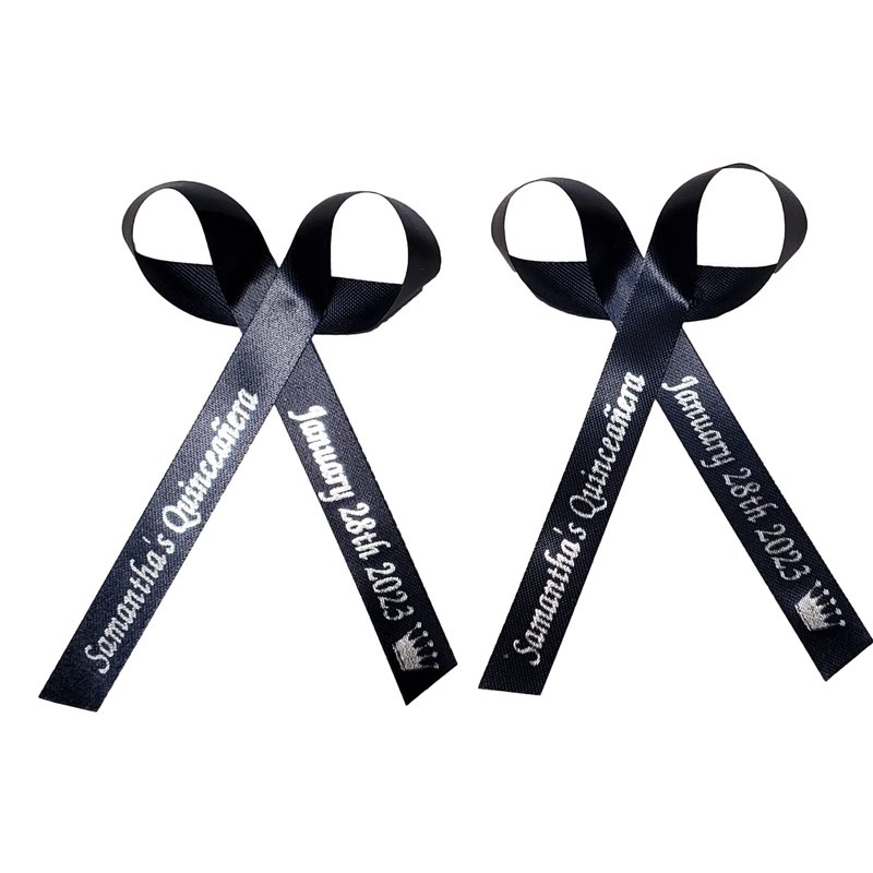 - NEW OPTIONS FOR CUT RIBBONS OR ASSEMBLED BOWS: Personalized pre-cut ribbons, ready to assemble for any occasion, assembly required (use a hot glue gun to assemble as shown in the photo). Pins are optional. Or Select the assembled bows that are ready made for you to attach to your party favors. Choose up to 24 characters per side plus an image.