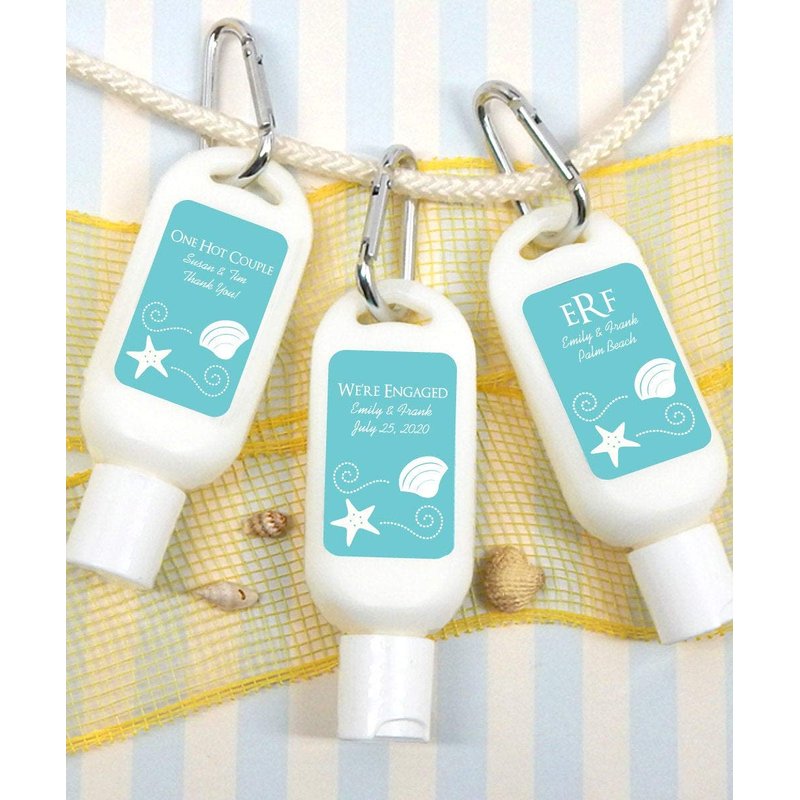 Offer your guests a reason to LOVE sun protection.... Personalized for your special event, perfectly sized for travel and completely convenient with an attached carabiner clip. These first-class favors ensure that your loved ones have no more excuses for not protecting their skin from harmful sun rays. Each eye catching container is filled with a rich yet lightweight SPF 30 sunscreen, infused with natural ingredients.... Organic Aloe Vera, Vitamin E and Sunflower Oil to nourish and soothe sun-exposed skin. Terrific for tropical destination weddings, weekend guest bags, beach barbecues, or any outdoor event!