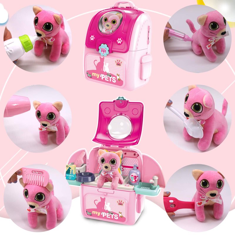 Pet Cat Carrier Backpack Toy, MAGIC4U 23PCS Pet Care Playset,Vet Clinic and Doctor Kit for Kids, Pet Veterinarian Medical Role Play Set for Boys and Girls Ages 3-6 Pink