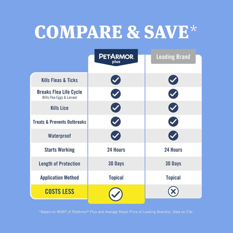 - Fast Acting Long-Lasting Flea and Tick Protection: One application of PetArmor Plus lasts up to 30 days nose to tail. A 6-dose package lasts 6 months