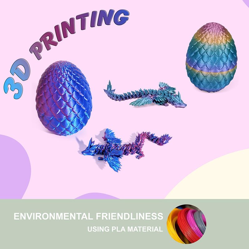 This 3D Printed Dragon in Easter eggs with Whings is a fun and unique gift for kids and adults alike. It's a great Easter basket stuffer, party favor, or office decoration. The dragon is articulated, so it can be posed in different positions, making it a great fidget toy. The dragon is made from high-quality PLA filament and is printed with a high-resolution 3D printer. It's durable and lightweight, making it easy to carry around. The dragon is also a great home office decor item, adding a touch of fantasy to your workspace.