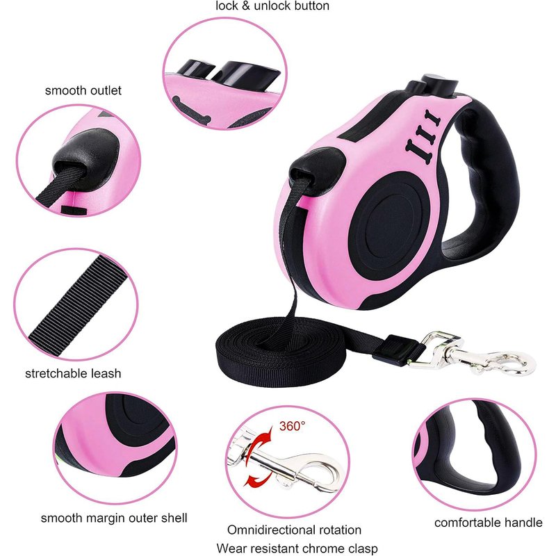 - Retractable Leash --- Package Includes: 1*Leash, 1*Bowl, 1* Dispenser, 2*rolls of waste bags, 1* buckle. Leash is 16FT/5m, suitable for small medium pets.