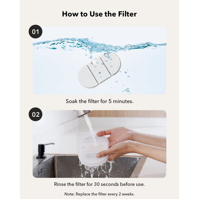 - Tips: Soak the filter for 5 minutes before use. To maintain the filtering effect, recommended to replace the filters every 2 weeks