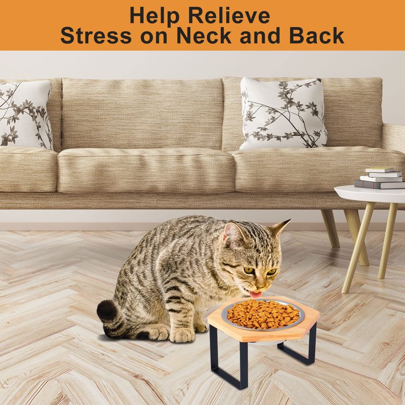 - 【Elevated Cat Bowl】 The elevated cat bowl is 3.9 inches high, just right for cats to eat easily and comfortably without having to bend down on the floor. It helps to relieve extra stress on your cat's neck and back and also helps to avoid digestive problems.