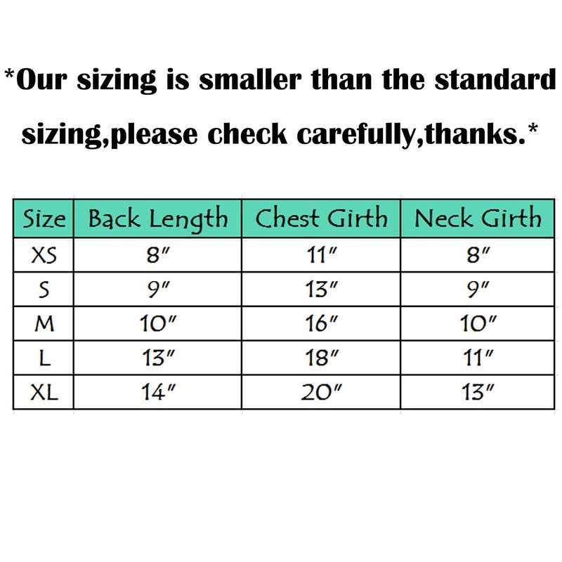 *Measuring Your Dog for a Perfect Fit* 1.How to measure your dog? There is a picture to show how to measure your dog above,please check it. 2.Your baby usually wears size S doesn't mean all size S will fit him/her. You looked at one size chart and found that your dog is a size small. But that doesn't mean he/she is a size small for all the clothes. Different designers and manufacturers use their own size charts. So the measurements given in a size SMALL by manufacturer "A" will be a size XS in manufacturer B's size chart. Don't buy a particular size because that is what you always buy in a pet shop or online store. Always look at the size chart for chest girth and length and confirm the size before you commit to buy. 3.If any of the measurements are 'between' two sizes, choose the larger size. If your measurements are toward the upper end of the range given for a particular size, you may also want to choose the larger size, as you may also wish to do for heavily coated dogs to accommodate all that fur. 4.Take each measurement a bit loosely. Take each measurement a bit loosely, so there will be room for your dog to move and breathe, but not too loose. (the measurement for Belly Bands is the exception -- it needs to be a bit snug) Please measure carefully before buying and email us if you have any questions about fit before you bid or make a purchase