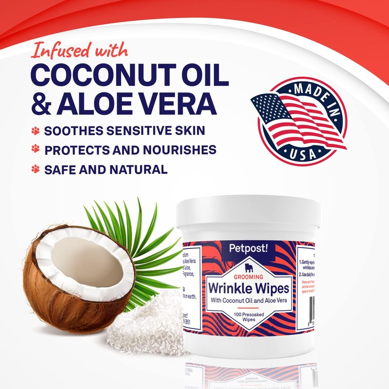 Petpost | Bulldog Wrinkle Wipes for Dogs - Cleans and Soothes Pug Wrinkles and Folds - Ultra Soft Cotton Pads in Coconut Oil Solution 100 ct.