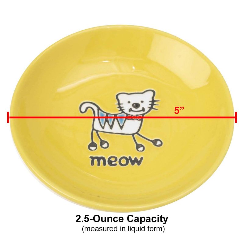 PetRageous 11019 Silly Kitty Dishwasher and Microwave Stoneware Cat Saucer 5-Inch Diameter 2.5-Ounce Capacity for Wet or Dry Cat Food Great For All Cats, Yellow