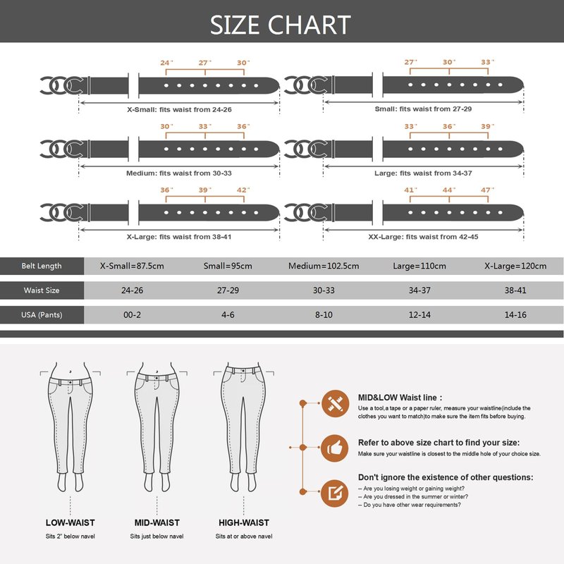 - [ Belts Size ] Womens belt in XS/S/M/L/XL size, belt wide 1 1/10", please measure your waistline(include the clothes you want to match)to make sure the item fits before buying. (Our size chart is different from Amazon, please check it more careful.)