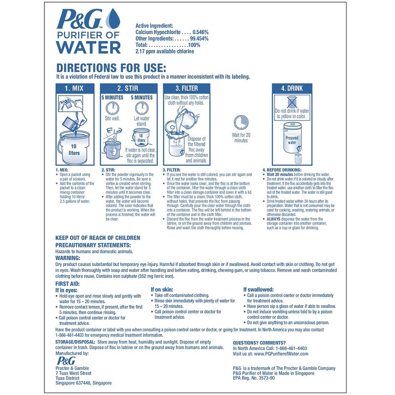 - SURVIVE OUT THERE - As an emergency water purifier, P&G water purification packets slip easily into your preparedness kit. These small pouches treat water for your whole family on the trail.