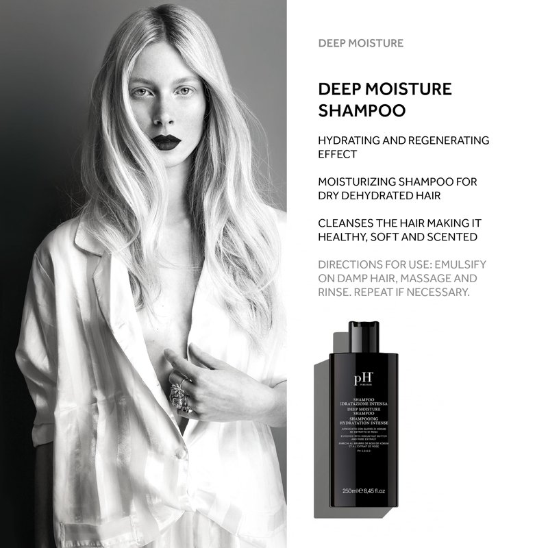 Regenerating and Moisturizing - Formulated with high quality Omega Fatty Acids, Vitamin E and Rose, this dry hair shampoo gently cleans and repais hair. dehydrated hair to achieve professional looking results. Fortifies & Strengthens - this conditoner mends damaged hair strands caused by dryness or dehydration. Designed to add more softness, shine, and elasticity to hair. Luxury Italian Hair Care - pH Labs stands as a dynamic and avant-garde Italian company, carving its niche in the realm of high-end hair products since its inception in 2013. The brand places equal emphasis on aesthetics and sensory experience, crafting products with modern designs and exclusive fragrances to deliver a truly immersive beauty experience. For the company, "Made in Italy" signifies a commitment to seamless quality and innovation, without any compromise. deep moisture - a regenerating moisturising treatment suitable for dry, dehydrated and brittle hair. it acts deep inside the hair, fortifying it and repairing split ends. and controls frizz.