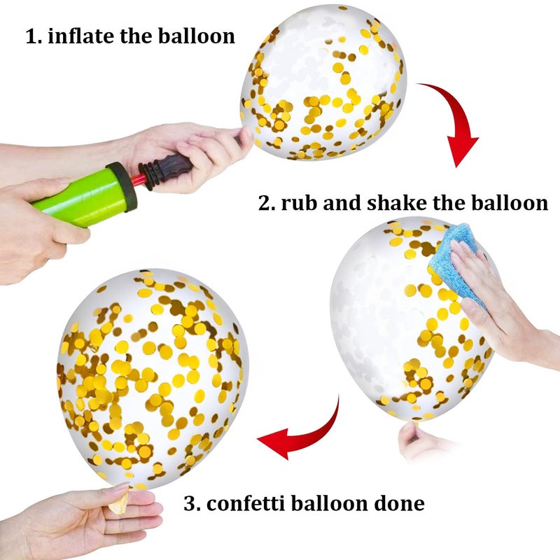 Confetti has been put into the balloons already, after inflated the balloon, gently rub confetti balloons with dry cloth, hair or silk, and shake the balloon, which will make the confetti easier stick to the balloons' inside surface.