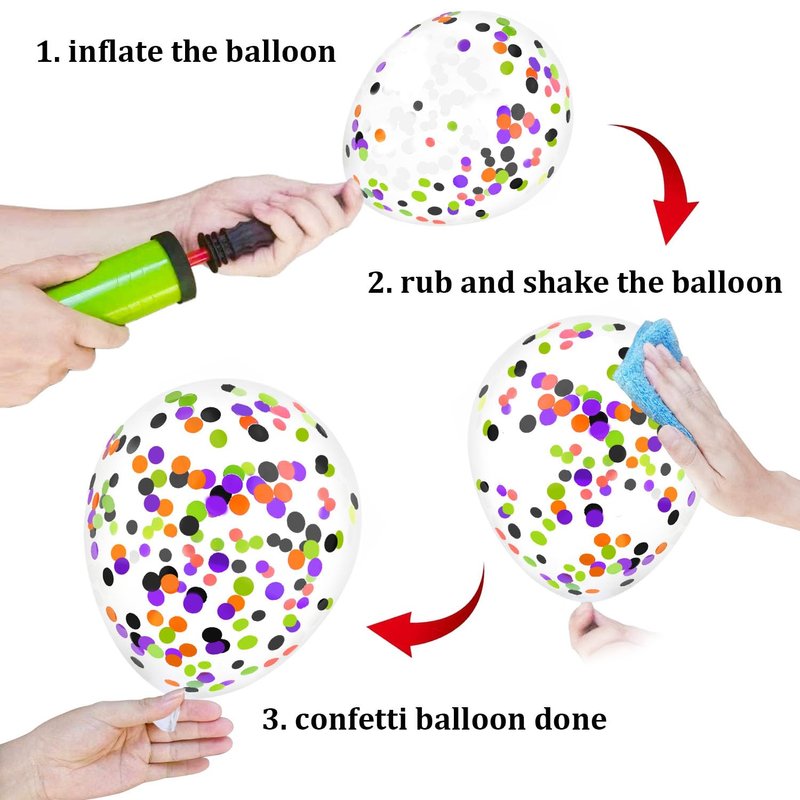 Confetti has been put into the balloons already, after inflated the balloon, gently rub confetti balloons with dry cloth, hair or silk, and shake the balloon, which will make the confetti easier stick to the balloons' inside surface.