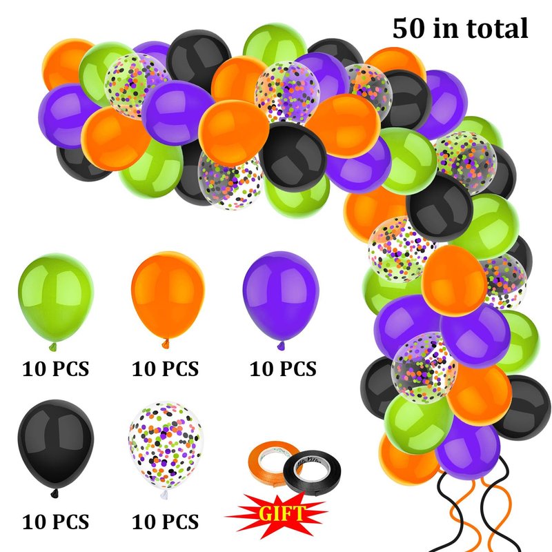 - Halloween Party Balloons: The balloon kit includes 50 pack 12-inch balloons in 5 colors, 10pcs per color, plus 2 rolls of 11 yards ribbons for gift.