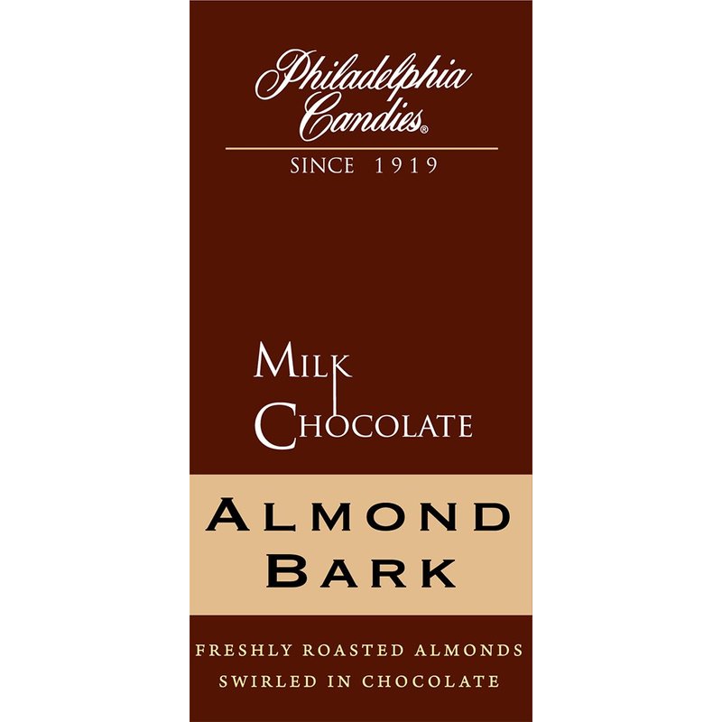 - Our Milk Chocolate Almond Bark is attractively presented in a signature gift bag. The finest almonds from California are covered in Philadelphia Candies premium milk chocolate.