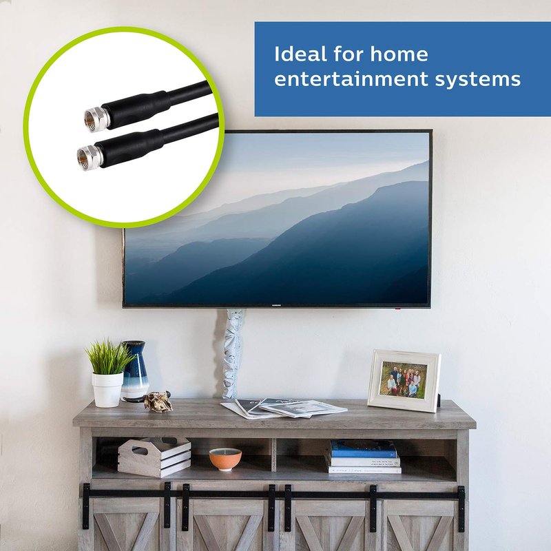 - UNIVERSAL COMPATIBILITY – The RG6 coax cable connects to any component with an F-type jack such as an antenna, DVR, VCR, Satellite, Cable Box, TV and other audio and video components.