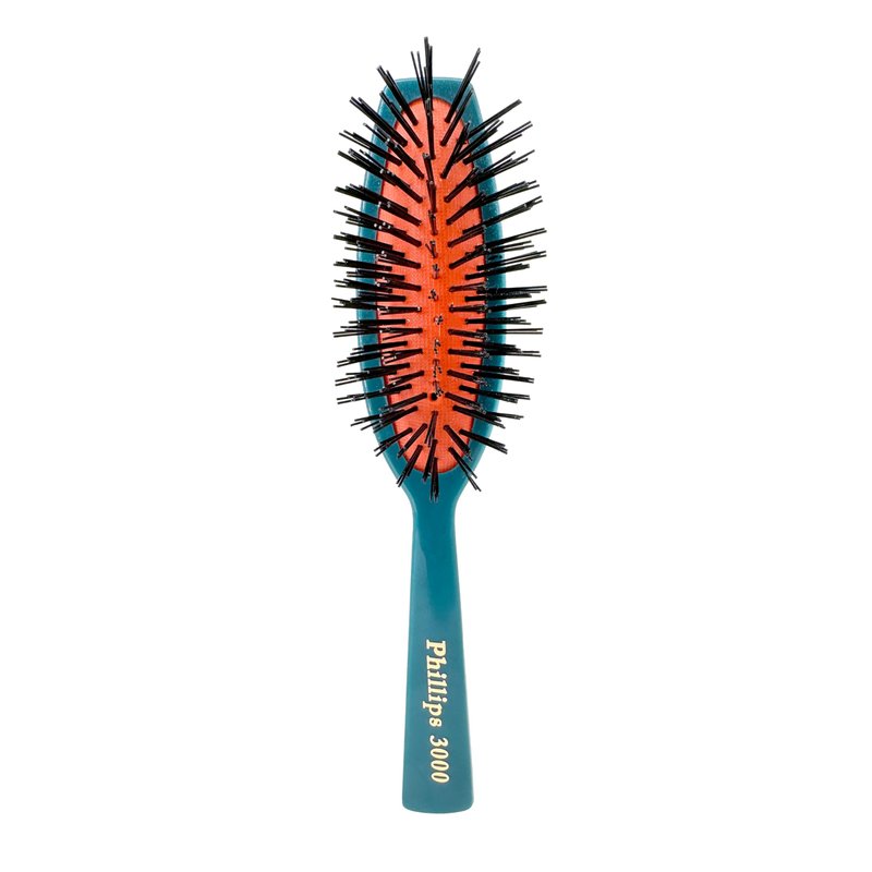 Touch up your hair anytime with the Phillips Brush 3000 Purse Size Cushion Hair Brush. Purse-size cushion brush features a flower design on the back of the handle. Nylon bristles. Small, compact size is perfect for touch ups on the go. Brush measures approximately 7 inches long x 2 inches wide x 1.5 inches high.