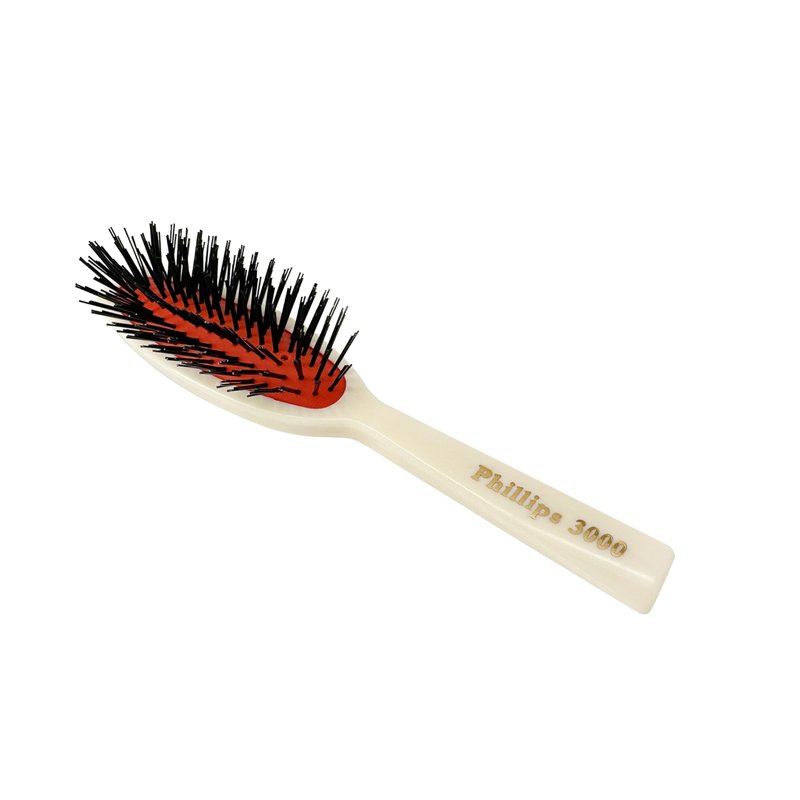 Touch up your hair anytime with the Phillips Brush 3000 Purse Size Cushion Hair Brush. Purse-size cushion brush features a flower design on the back of the handle. Nylon bristles. Small, compact size is perfect for touch ups on the go. Brush measures approximately 7 inches long x 2 inches wide x 1.5 inches high.