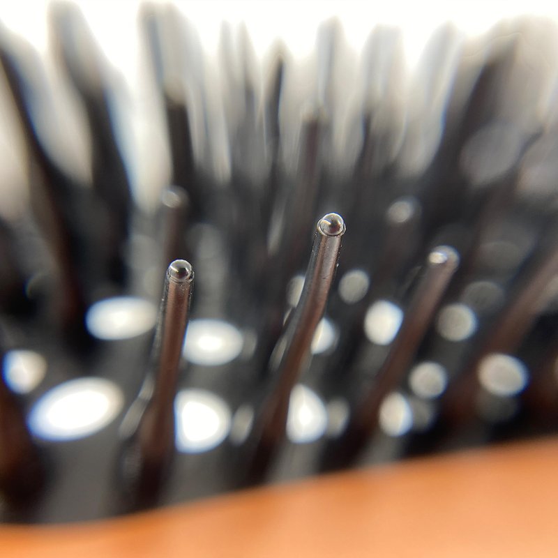 - Flexible rubber cushion and rounded pins for effortless detangling while maintaining curls