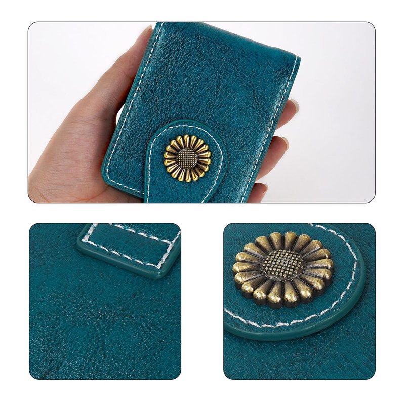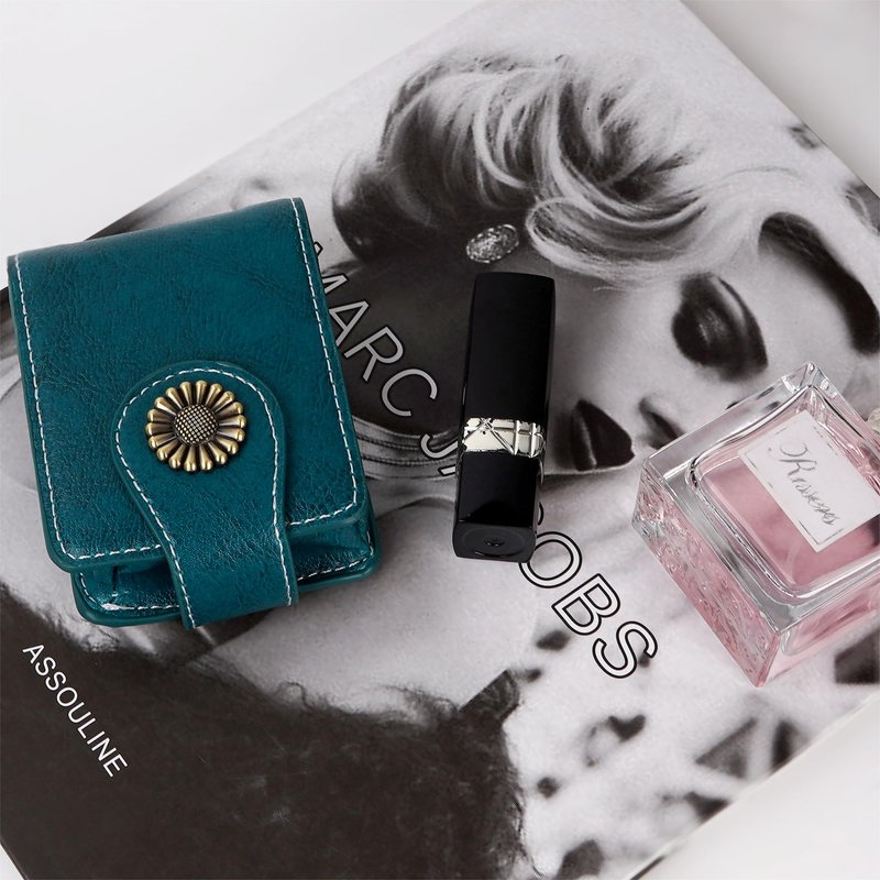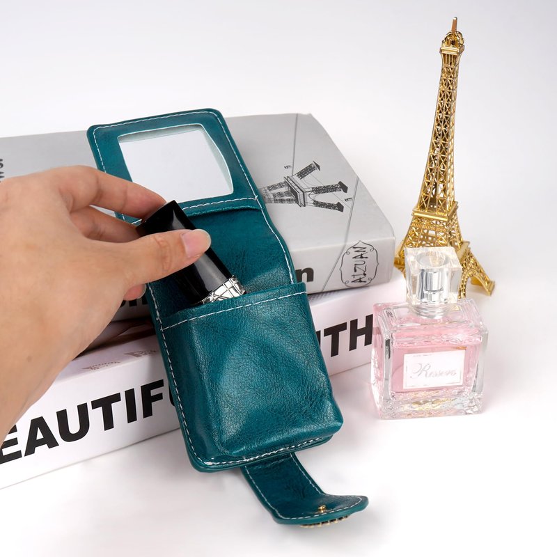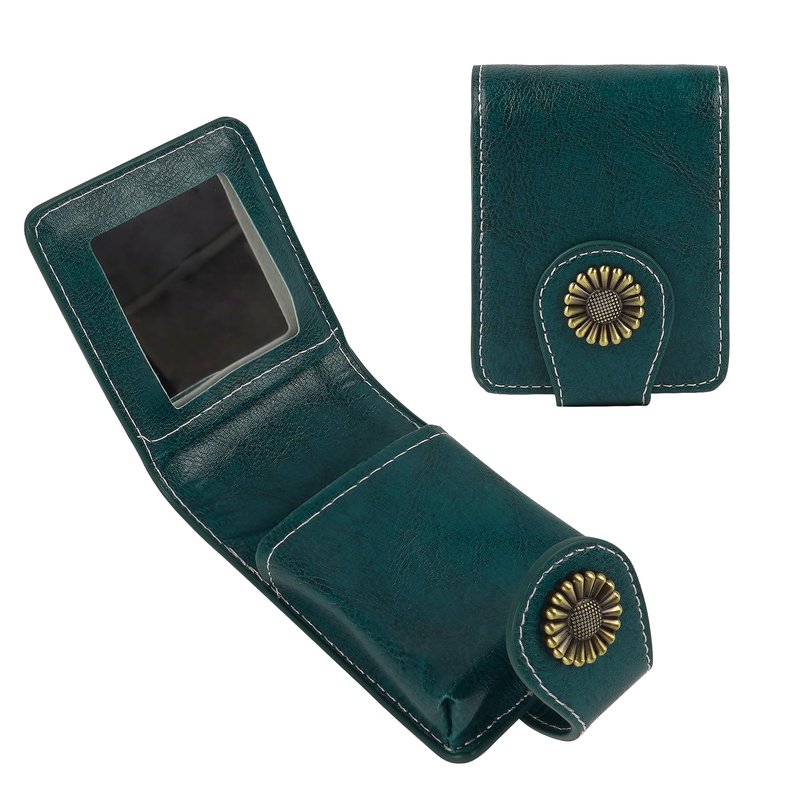 Keep your favorite lipsticks close at hand with this Leatherette Lipstick Holder with Mirror. Designed with a retro teal green exterior adorned with rustic metal flower ornament, this small lipstick case adds a touch of elegance to your everyday essentials. The built-in mirror is great for on-the-go touch-ups, while the snap closure keeps your lipsticks secure and easily accessible. Compact enough for your purse, backpack, or pocket, this slim makeup organizer combines practicality and fashion. Keep your favorite lipsticks protected and always within reach with this stylish and practical accessory.