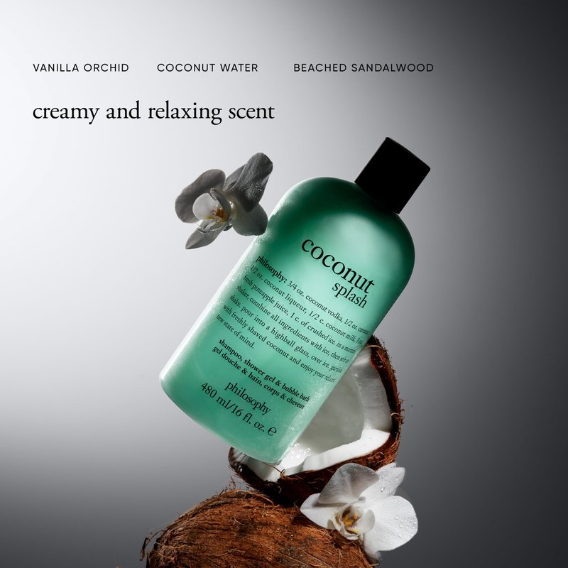 - transport yourself to a moment of self-care with the ultra-creamy, iconic philosophy shower gel, upgraded with a skin-hugging moisture complex for intense hydration that won’t be rinsed off yet doesn’t leave the feel of a film or residue. the moisture-barrier-respecting formula efficiently cleanses, soothes, and comforts dry skin, while a refreshingly sweet coconut, vanilla orchid and sandalwood scent carries you away on an island breeze.