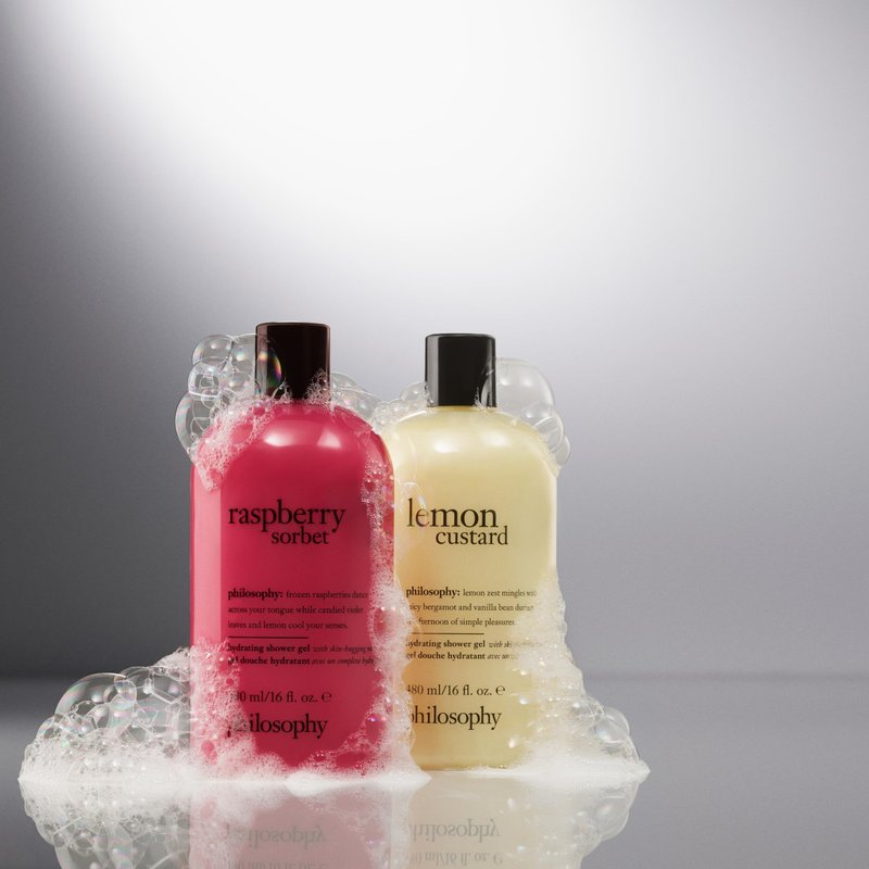 - transport yourself to a moment of self-care with the ultra-creamy, iconic philosophy shower gel, upgraded with a skin-hugging moisture complex for intense hydration that won’t be rinsed off yet doesn’t leave the feel of a film or residue. the moisture-barrier-respecting formula efficiently cleanses, soothes, and comforts dry skin, while an inviting lemon, bergamot and vanilla bean scent encourages you to savor the simple pleasures in life.