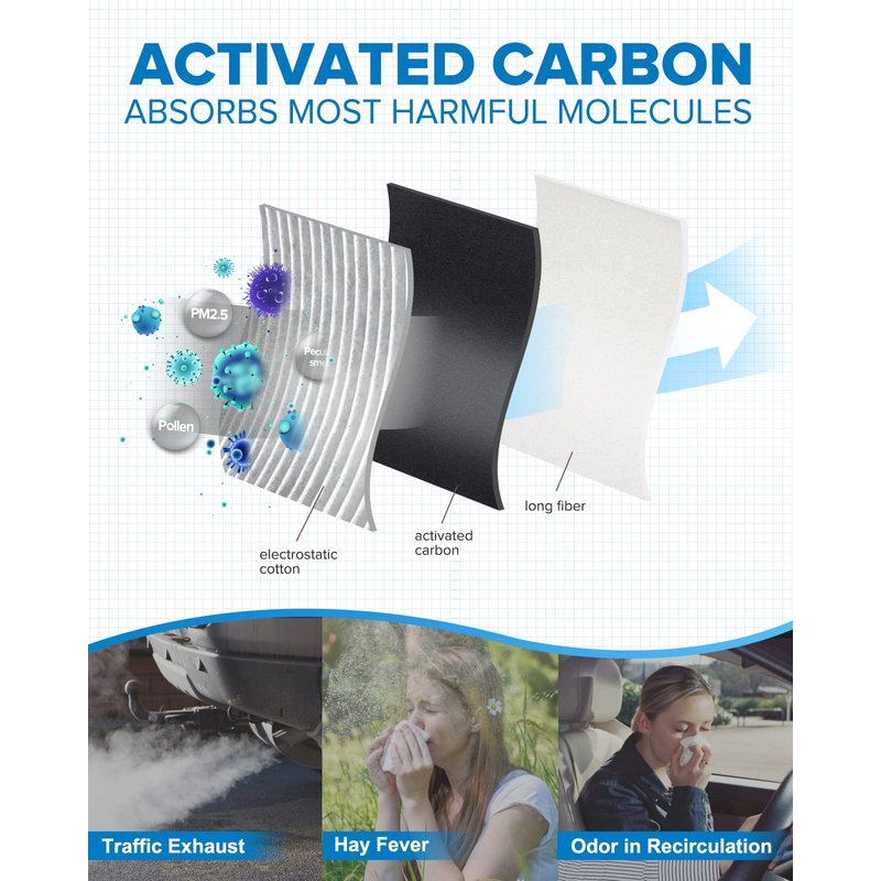 - Keep Clean&Fresh Air: PHILTOP cabin air filter has 32 layers of folds and is made of fiber layer electrostatic cotton material, which has a stronger ability to absorb dust. The cabin filter combination with activated carbon helps remove the odor inside the car, provides fresh air for the driver and passengers.
