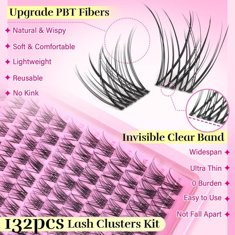 - Natural Lash Clusters Kit: The super natural lash clusters kit is here! You will get 132Pcs invisible clear band lash clusters, new strong hold lash glue bond and seal and lash tweezers easy to use. Exquisite lash extension kit, large capacity lashes clusters, super affordable, extreme charm