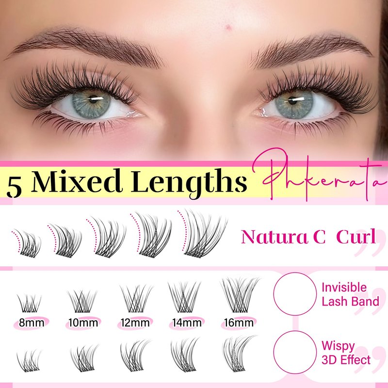 - Wispy C Curl Eyelash Clusters: The wispy lash extension kit helps you create a natural 3D lashes effect. The cluster eyelash extensions kit is made from soft PBT lash fibers for safety, comfort and a long-lasting c curl, 5 mix lengths(8-10-12-14-16mm) for easy lash salon at home