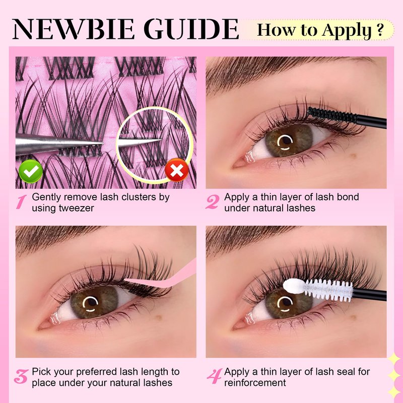 - Lash Bond and Seal & Precision Tweezers: The kit includes a 2IN1 lash bond and seal glue for a strong, long-lasting hold. High-precision tweezers help place individual lash clusters easily and accurately. Following our user guide, you friends can wear the cluster lashes kit very easily
