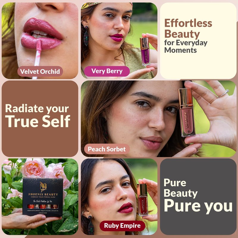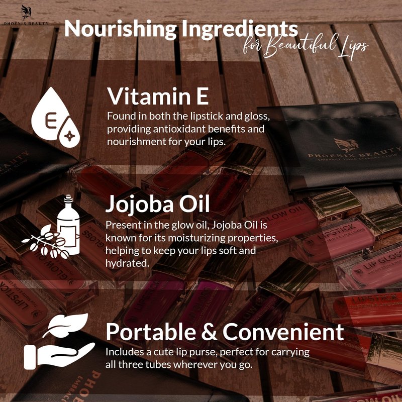 Unleash your inner phoenix with Phoenix Beauty’s The Bold Ambition Lip Trio! Our meticulously curated set is designed for the modern woman who shines brightly and lives boldly. Whether you’re aiming for a statement matte look with our smudge-proof and long lasting Liquid Matte Lipstick, a radiant glow with our Vibrant Lip Gloss, or nourishing care with our Lip Glow Oil enriched with the goodness of Jojoba Oil, this trio has it all. Each product is infused with high-quality ingredients and Vitamin-E that provide longevity, comfort and nourishment. The colors have been chosen to suit a variety of skin tones and occasions, making this set a versatile addition to any makeup collection. Included in this trio is a stylish black pouch, which is not just practical but also a chic accessory to complement any style. Ideal for gifting or simply treating yourself, get ready to turn heads and embrace your eternal glow with Phoenix Beauty. Embrace your bold, embrace your beauty — because you're worth it! Get all the colors today and let your lips speak volumes about your fearless spirit.