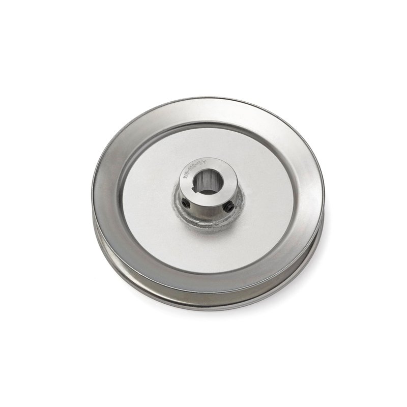 This V-Groove Drive Pulley is for use as a general purpose pulley for power transmission such as compressors, industrial fans, lawnmowers, snowblowers and electrical motors. It has a hub attached and the inside diameter is 3/4''. This pulley comes with 2 set screw holes. The heavy duty steel is designed to be more durable. This part is Zinc-plated or Painted to prevent rust. Additional Features: Made of Steel Works with 4L/A|5L/B belts Heavy duty split steel