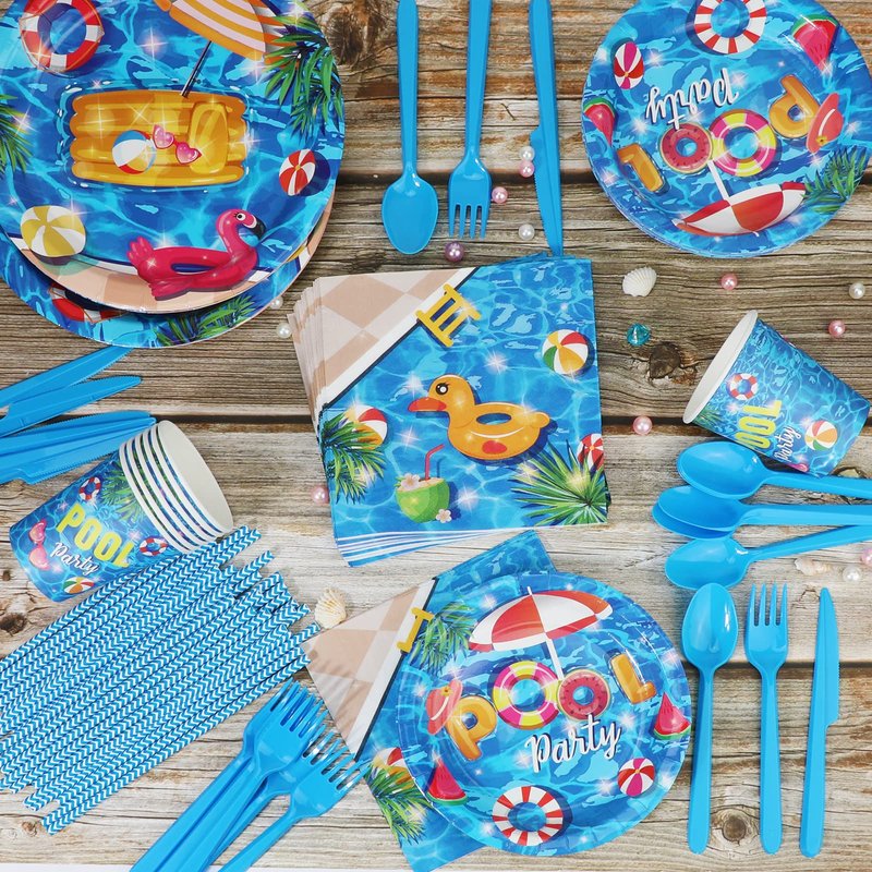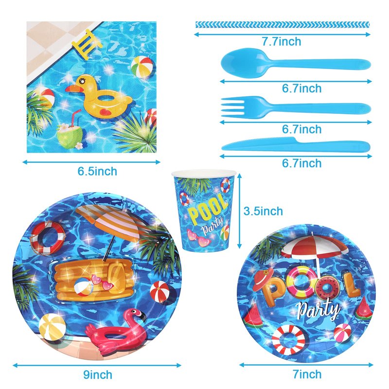 - QUICK AND EASY CLEAN UP: Our birthday pool party decorations are suitable for onetime use and are easy to clean up. You can collect the tableware kit and dispose of them after the party, saving you cleaning time, so you can enjoy time with family and friends.