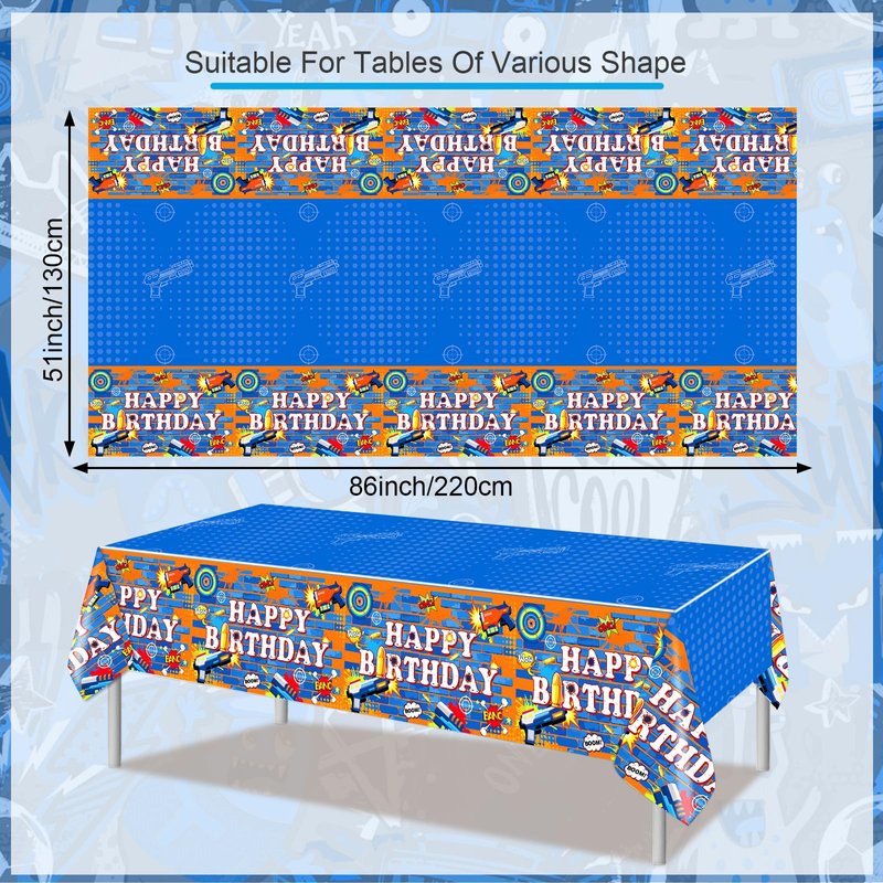- PERFECT FOR DART WAR DECORATIONS: These 2 rectangular tablecloths, measuring 54" x 108" each, are the ideal backdrop for your little soldier's special day. Whether it's a nerf gun birthday party or any gunfight celebration, the dynamic design adds a playful and festive touch to your event decor. Complete the look with nerf party favors and nerf balloons for a truly immersive experience.