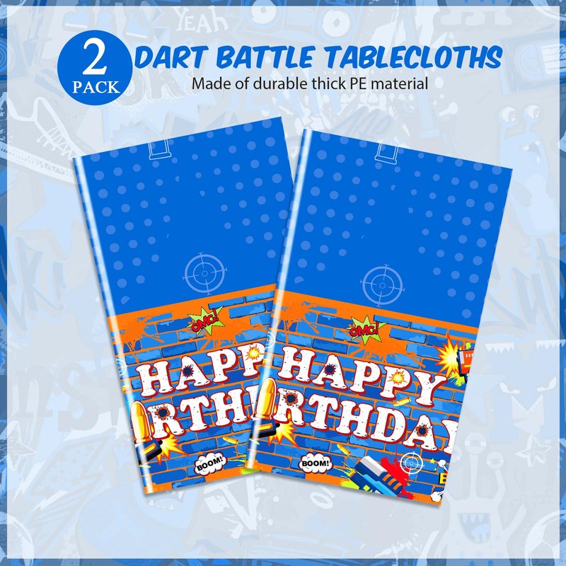 - DURABLE CONSTRUCTION: The Dart Battle Tablecloths set is meticulously engineered from premium-quality plastic, guaranteeing robustness against the rigors of play. These birthday tablecloth are designed to endure the excitement of dart war-themed events, ensuring a reliable investment for long-lasting use. Perfect for nerf gun birthday party and nerf party supplies for boys birthday.