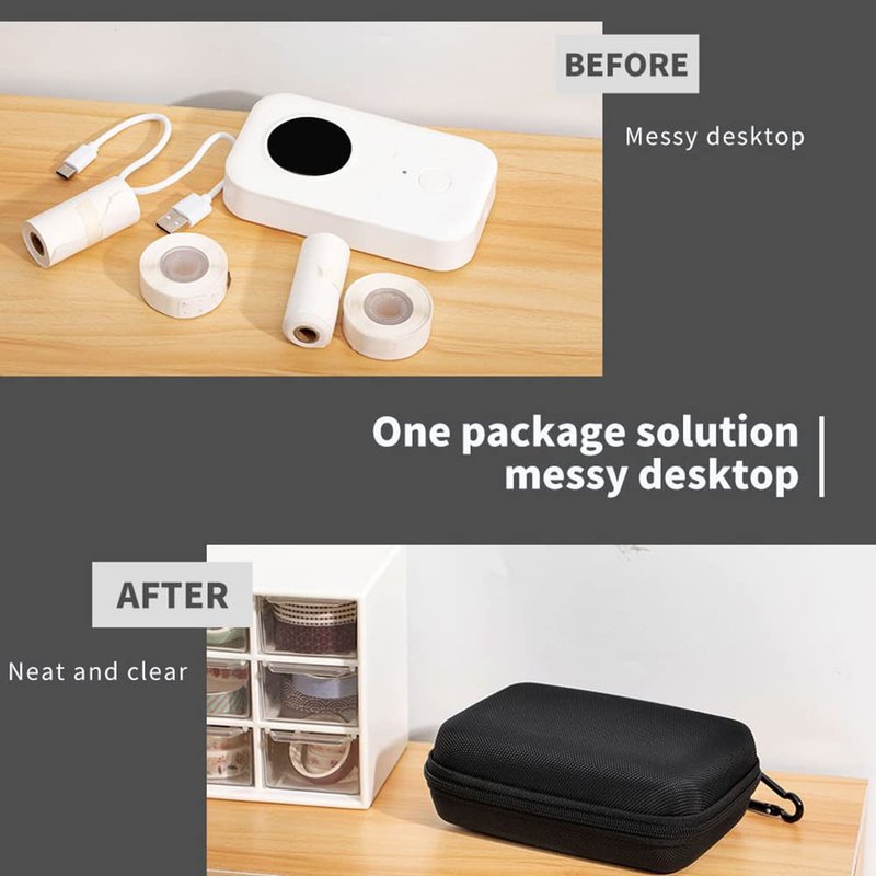 - [Storage bag size]- 100mm*150mm*60mm, can accommodate a printer and a small amount of paper rolls and an USB cable. Phomemo Mini Hard Shell Protection Box is waterproof, dustproof and shockproof. It has a built-in storage compartment and a bumper belt to effectively protect the printer from damage.