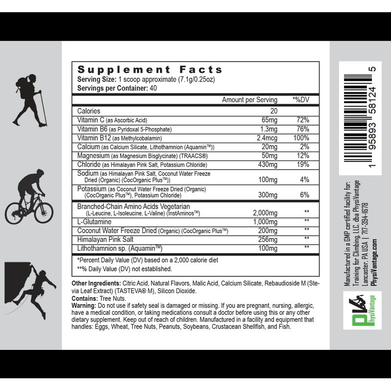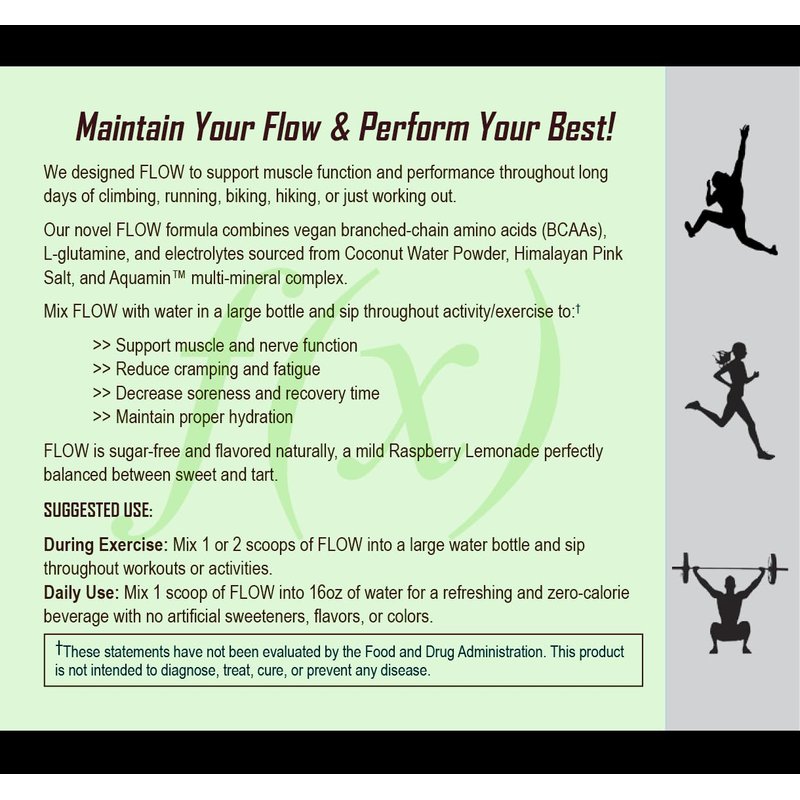 FLOW was scientifically formulated to support muscle function and performance throughout long sessions of climbing, running, hiking, biking, or just working out...and to help accelerate recovery and rehydration when you're done! Our novel 2-in-1 FLOW formula combines premium-grade ingredients including vegan branched-chain amino acids (BCAAs), L-glutamine, and critical electrolytes naturally sourced from Coconut Water Powder, Himalayan Pink Salt, and Aquamin multi-mineral complex providing 300mg of muscle-recharging Potassium! Drink FLOW post-workout to support rehydration and recovery, or mix FLOW in a water bottle and sip it throughout activity/exercise to: Support muscle and nerve function, reduce cramping and fatigue, decrease soreness and recovery time, and maintain proper hydration. FLOW is sugar-free and flavored naturally, a mild Raspberry Lemonade perfectly balanced between sweet and tart. Delicious! Keto, Sugar-Free, Dairy Free, Gluten Free, Non-GMO, and Vegan.