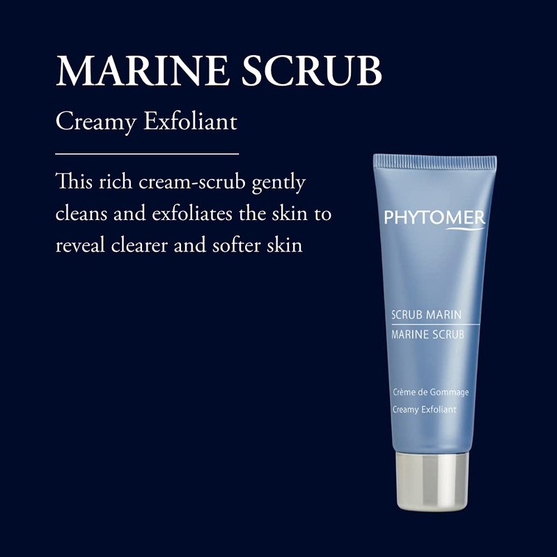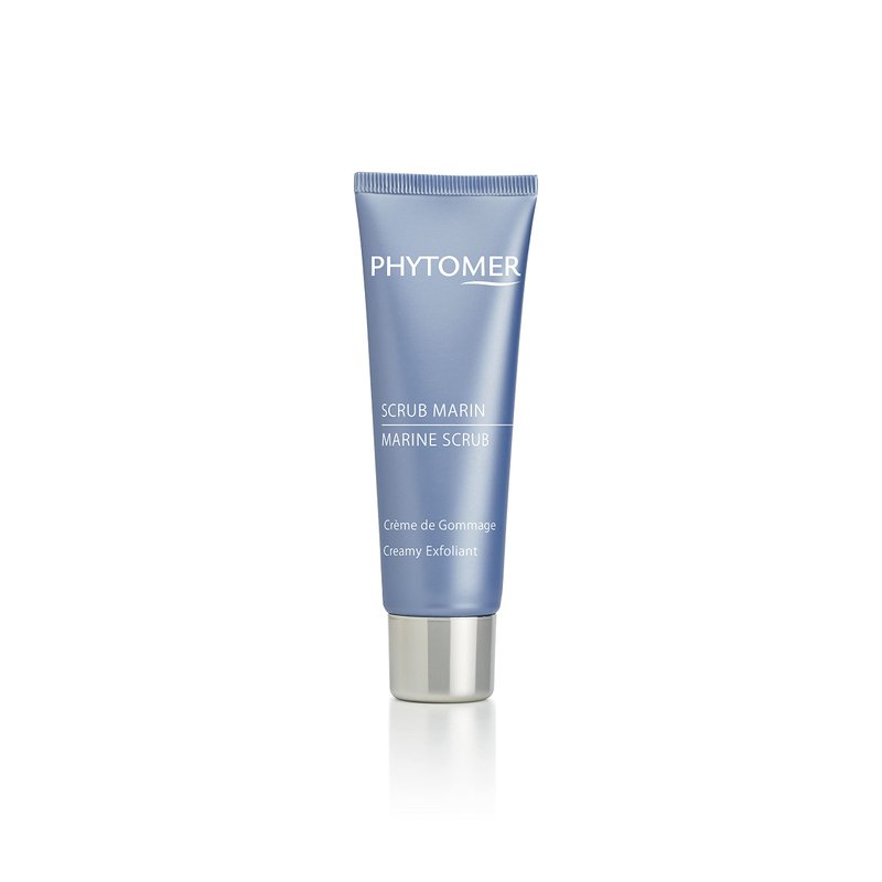 PHYTOMER Marine Scrub Creamy Face Exfoliant - This rich cream-scrub gently cleans and exfoliates the skin to reveal clearer and softer skin. With use, skin texture is refined and the complexion is radiant. Our marine ingredients include: Black Sand and Pumice Stone, for mechanical exfoliation; Chondrus crispus oil, provides moisture to skin; OLIGOMER, delivers an ideal supply of all trace elements to strengthen the skin and help prevent cellular fatigue. Each and every PHYTOMER product must meet our mission goals: to create safe, high-performance cosmetic treatments using eco-friendly means that protect the sea and its biodiversity.