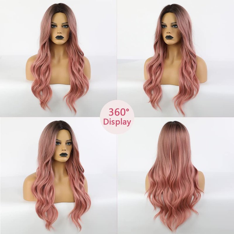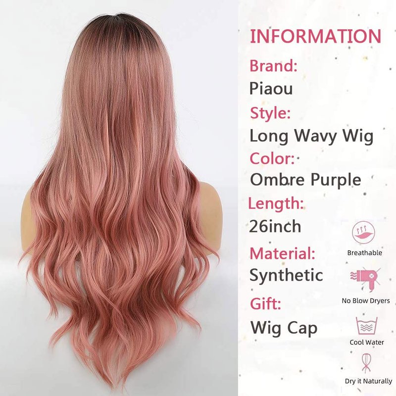 piaou Ombre Black to Pink Wig Synthetic Wigs for Women Long Natural Wave Heat Resistant Hair Wigs Natural Looking Cosplay Wig for women (Ombre Black to Pink)