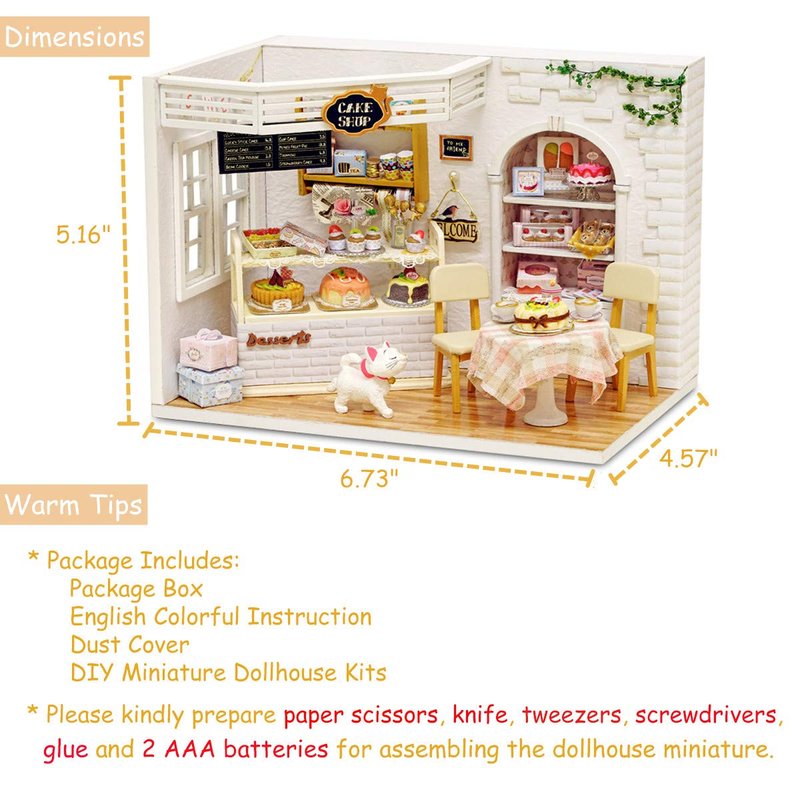 - Warm Tips - 1.)Paper scissors, knife, tweezers, screwdrivers, rulers, silicone liquid glue and 2 x AAA batteries are not included in the package, please kindly prepare them before assembling the dollhouse kit. 2.)Suitable for kids above 14 years old to assemble. It will be better if parents can help children to complete the miniature house kit together