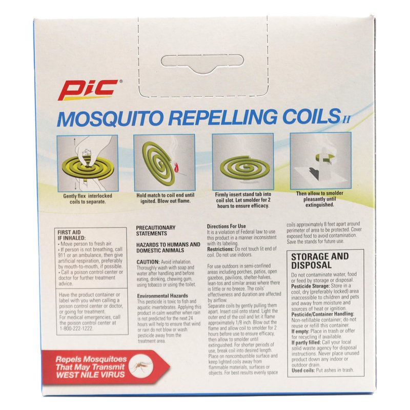 PIC Mosquito Repellent Coils contain a proven formula of Pyrethrum. Each coil lasts up to 5 to 7 hours. Comes with reusable metal stands. Mosquito Coils help repel mosquitoes in confined areas outdoors. It is useful in places where there is little or no breeze such as patios and porches. Do not use indoors and see packaging for additional instructions for proper use. Coils repel mosquitoes and are effective when positioned every 10 feet. Each coil burns for 5-7 hours and is best used outside on patios and porches. For outdoor use only. Use the enclosed metal holder for positioning the coil above the surface of your patio table or wherever you place the coil for repelling mosquitoes. Note the direction of any breeze or wind when placing the coil around outdoor activity.