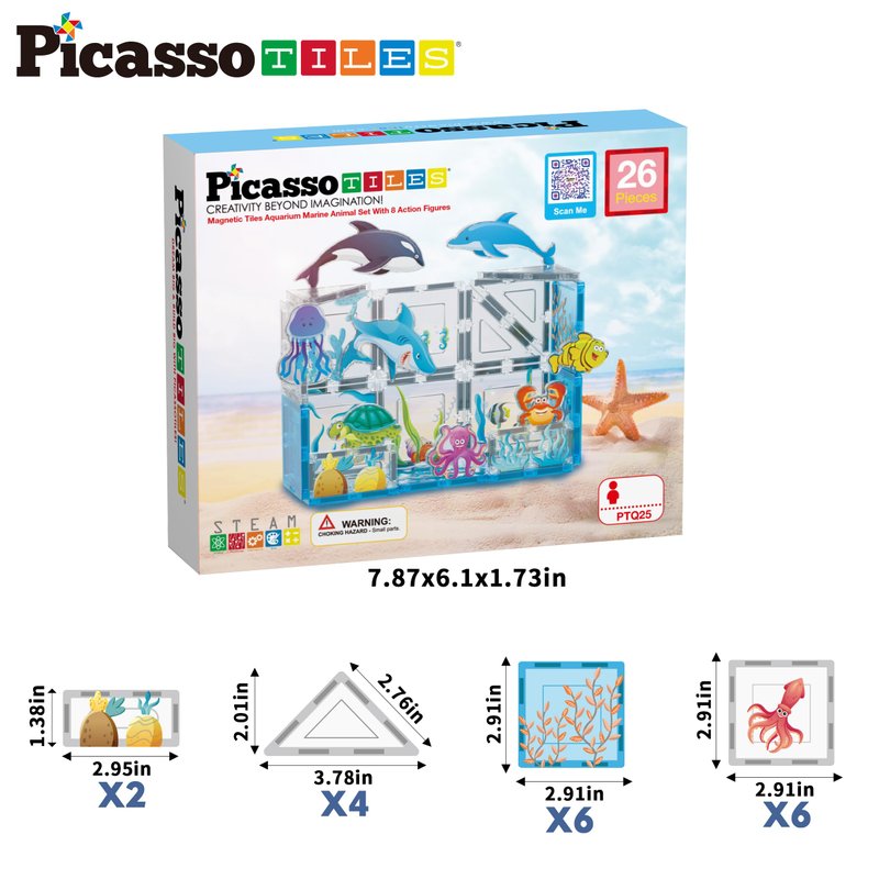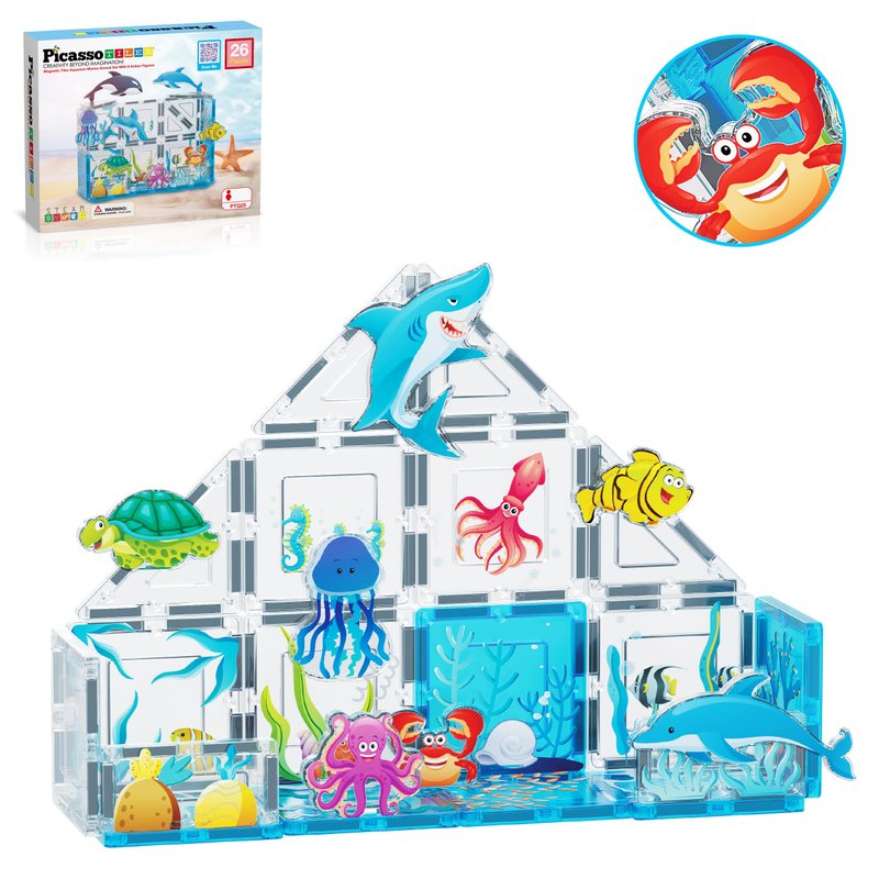 - DREAM BIG & BUILD BIG: Introducing PicassoTiles’ Marine Animal World themed set. Featuring 26 magnetic building block toy pieces, including 8 Aquarium Character Action Figures, Orca, Jellyfish, Shark, Tropical Fish, Crab, Octopus, Dolphin, and a Sea Turtle. In addition, explore with printed magnet construction tiles, 2 rectangles, 12 squares, and 4 triangles. This playset will Inspire hours of imaginative pretend play and discovery. Suitable for boys and girls ages 3 and up.