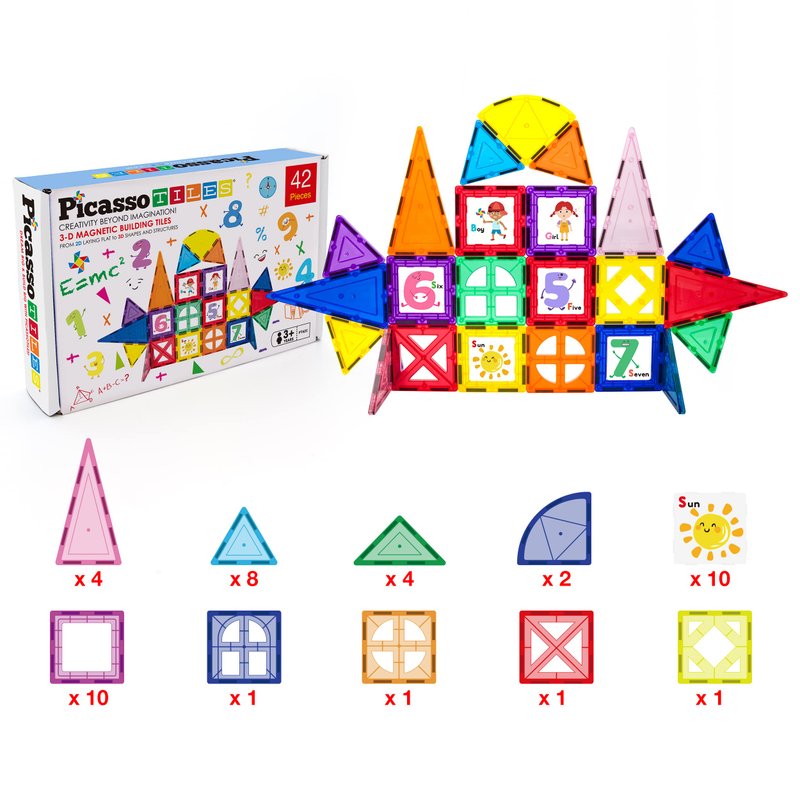 - DREAM BIG & BUILD BIG - No limitations, scalable to build as big as desired by adding more pieces to create the masterpiece. The 42pc magnetic building block feature 20 creative design graphics from 10 click-in cards with fun object, number, emotion expression, and character artworks and 32 other tiles to be used as stand-alone set or in conjunction with other PicassoTiles magnet construction toys as integrated add-on pieces to offer open-ended possibilities to cultivate children's creativity