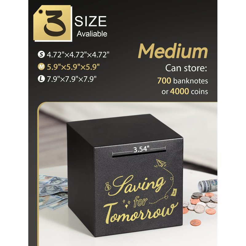 - 【3-Size Savings Plan for All Ages】We provide three sizes: SMALL, MEDIUM, LARGE. Not only for children with savings goals, would be a nice choice for adults learning about the value of and how to save money. Our 5.9-inch black safe piggy bank can store about 4000 coins or 700 bills at full capacity