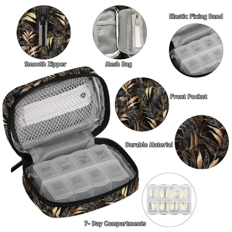 - 7 DAY PILL ORGANIZERS CASES: Elegant leaf soft cloth pill case with zipper, one front pocket for card, Inside one plastic pill box with 8 compartments + one mesh bag with zipper + 2 mesh pockets, enough to hold vitamins, pill supplements, cod liver oil supplements and medicine bottles weekly.