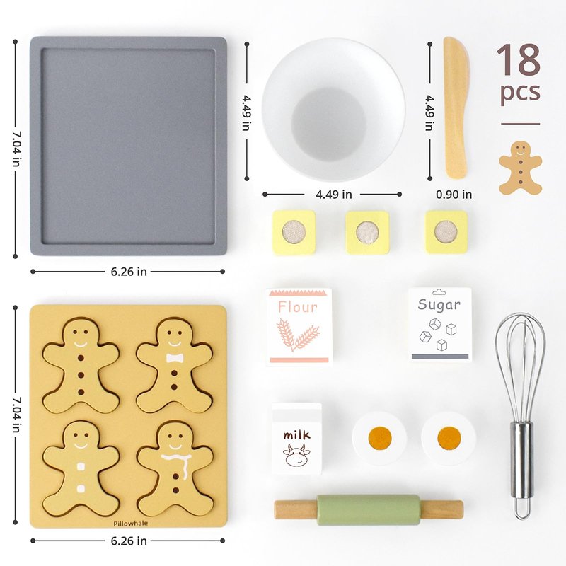 - KIDS PLAY KITCHEN - 18 pieces, accessories for this pretend play food set include sliceable gingerbread man cookies, cookie sheet, whisk, mixing bowl, cookie cutter, rolling pin, eggs, sugar bag, flour bag, milk, butter.